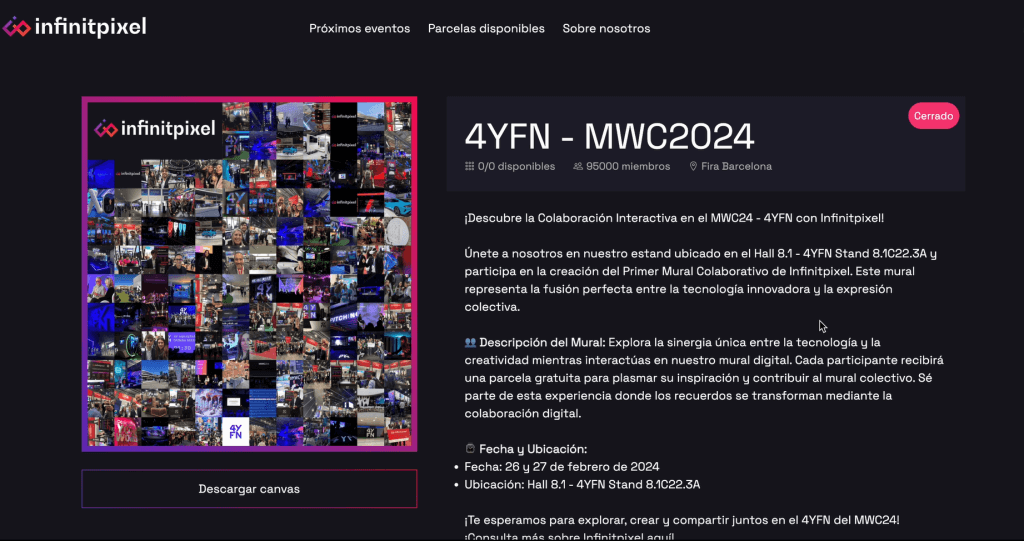 Infinit pixel es una innovadora plataforma que permite a los administradores crear murales digitales colaborativos. A través de la plataforma, los participantes de eventos pueden registrarse, adquirir parcelas y subir sus fotos, contribuyendo así a la creación de un mural único y compartido. Este servicio es particularmente atractivo para organizadores de eventos y comunidades que buscan fomentar la participación y el reconocimiento de sus miembros.